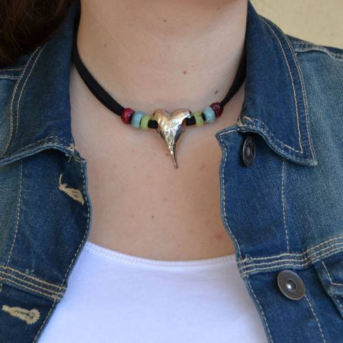 Colgante juvenil, pieza principal un corazón en zamak complementado con resinas de colores.