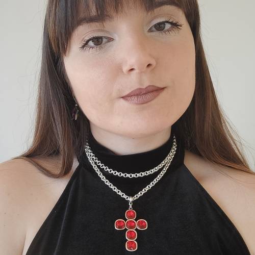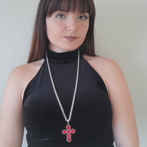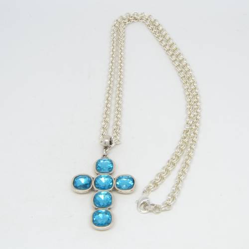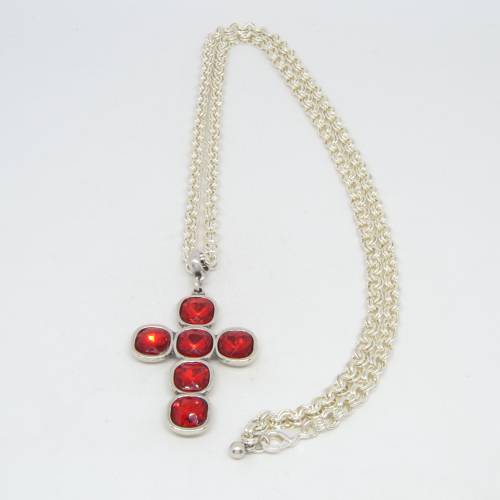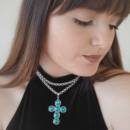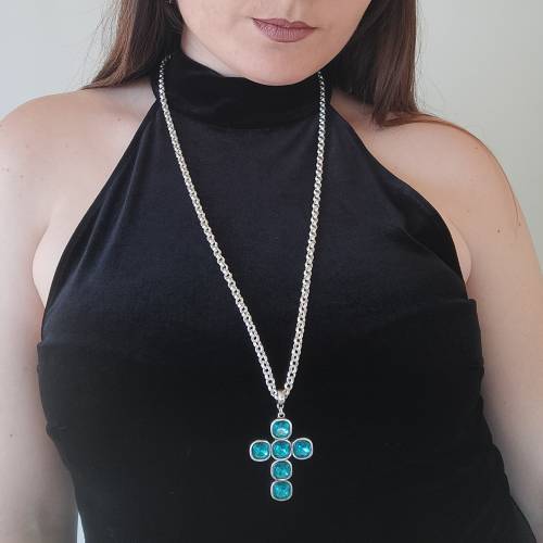 Nuestro colgante Cruz con cristales tallados de gran belleza en tono turquesa y rojo es realmente impresionante.