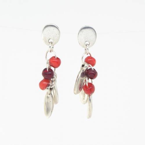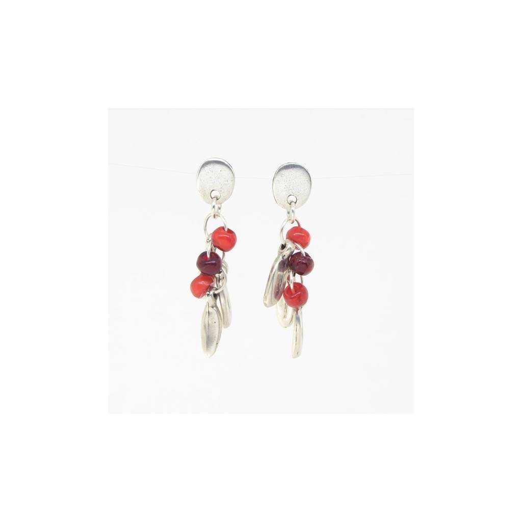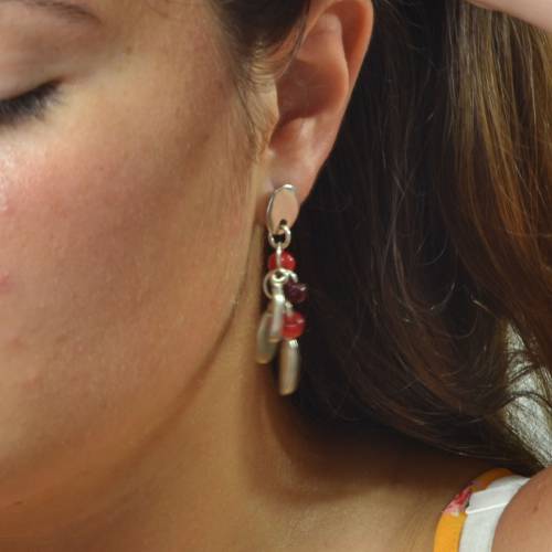 Pendientes realizados en zamak con resinas de colores en vino y rojo.