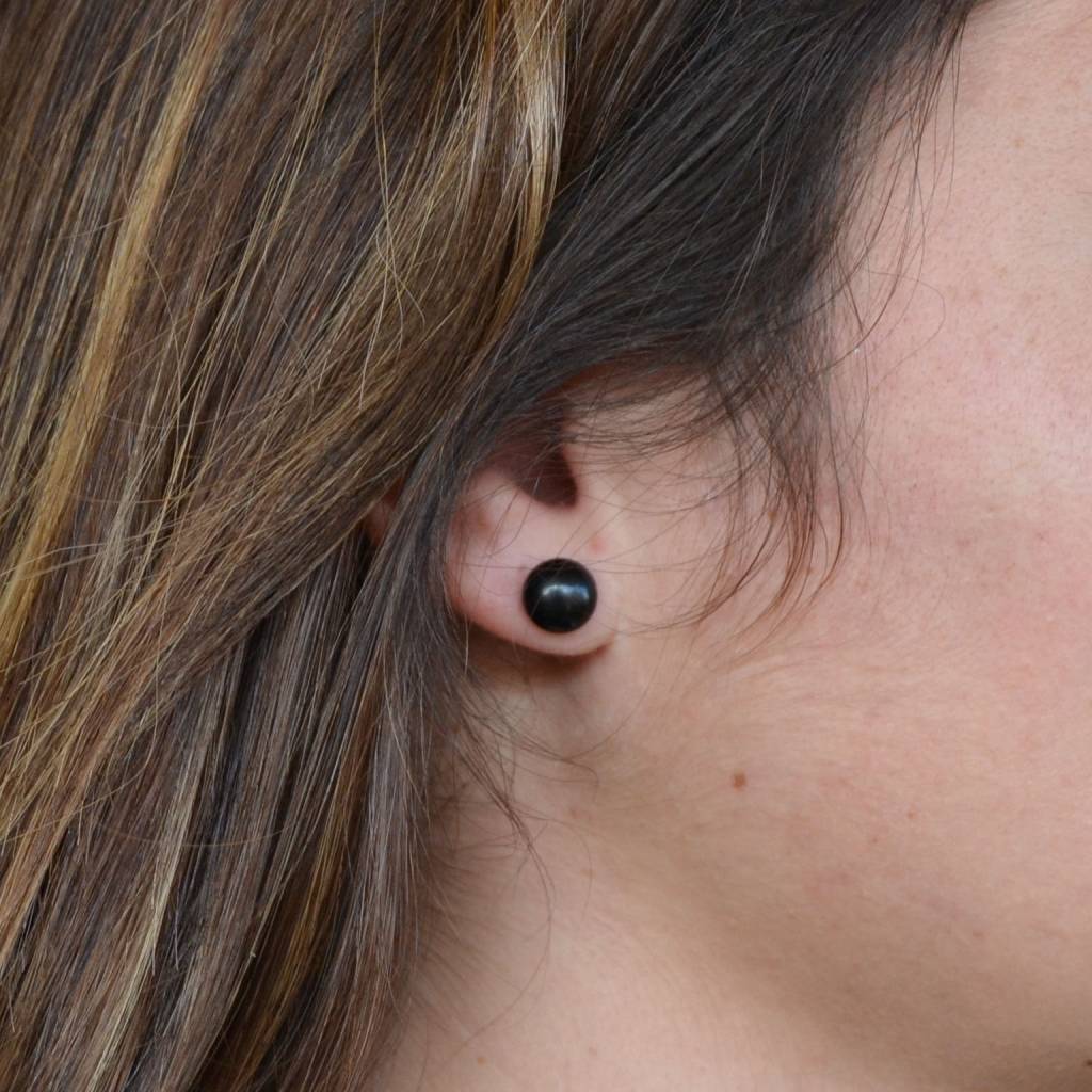 Unos pendientes para toda la vida, realizados en vidrio en color negro brillante y montados en plata de ley con cierre de presión.