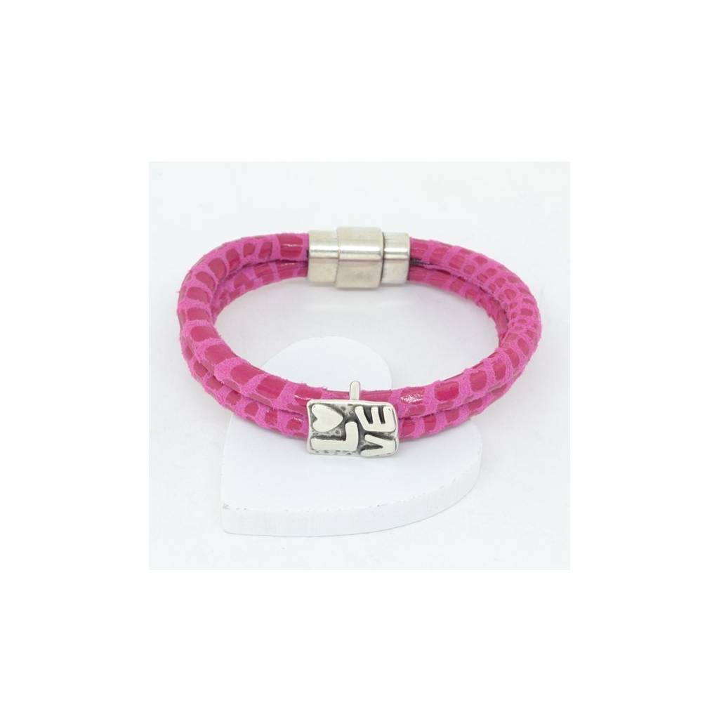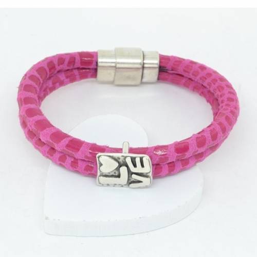 Pulsera realizada en cuero color rosa, con piezas de zamak y cierre de imán.